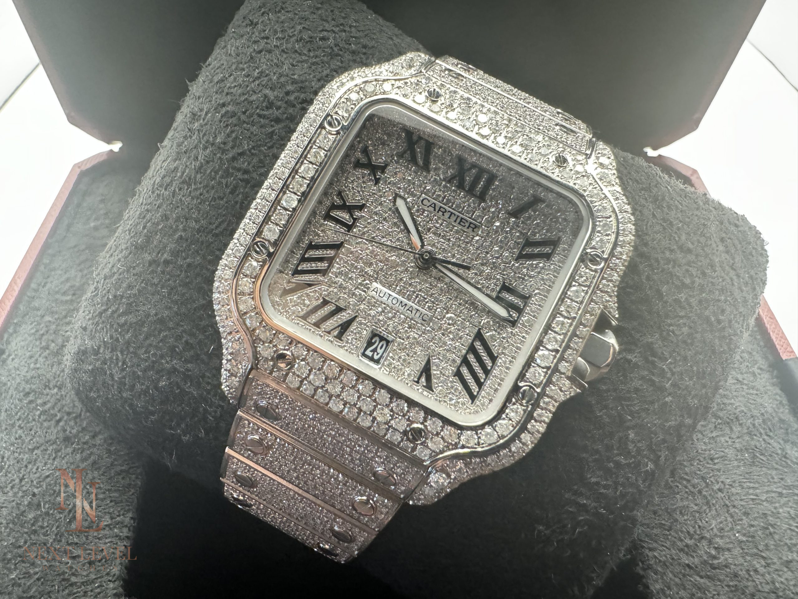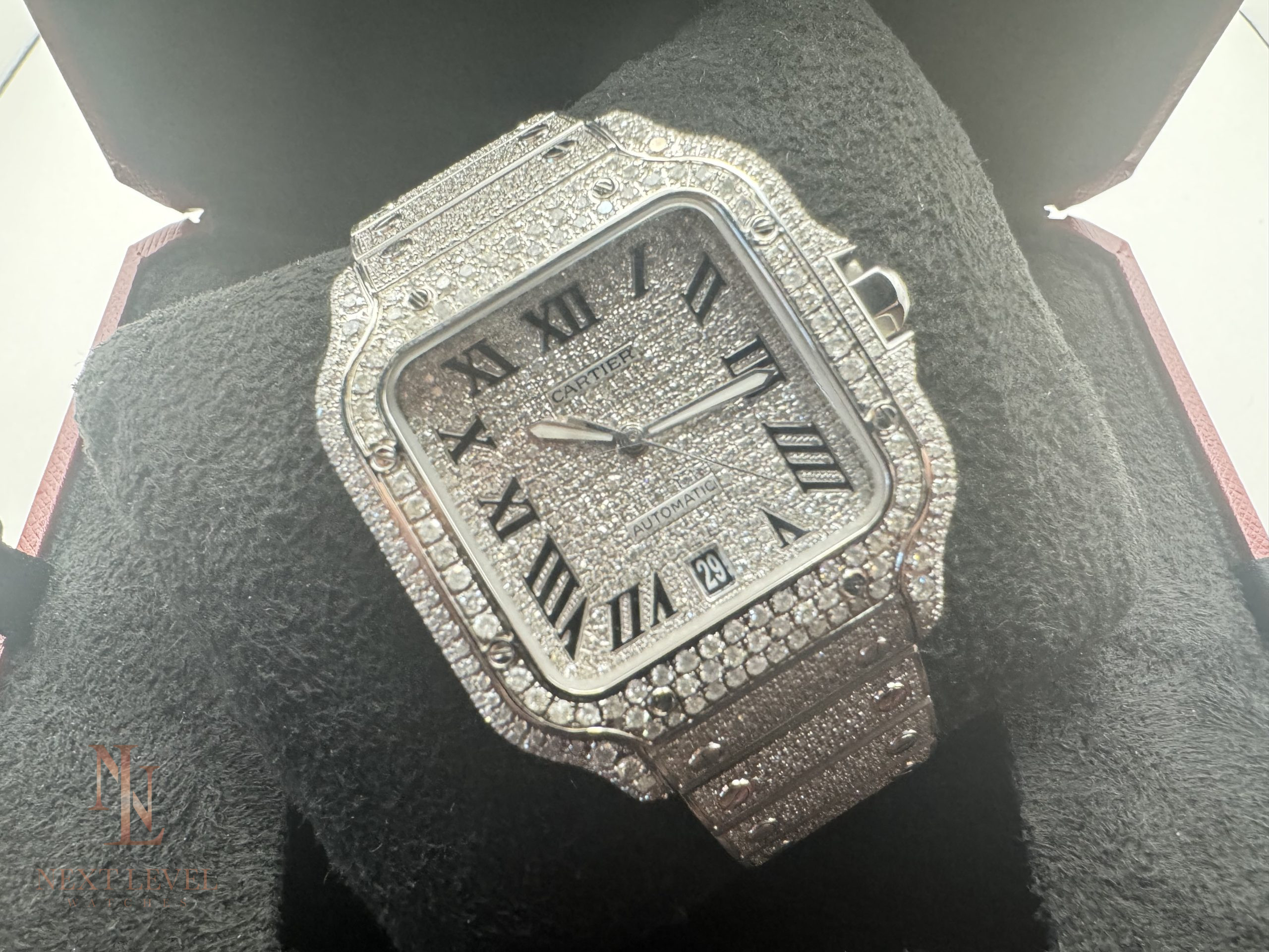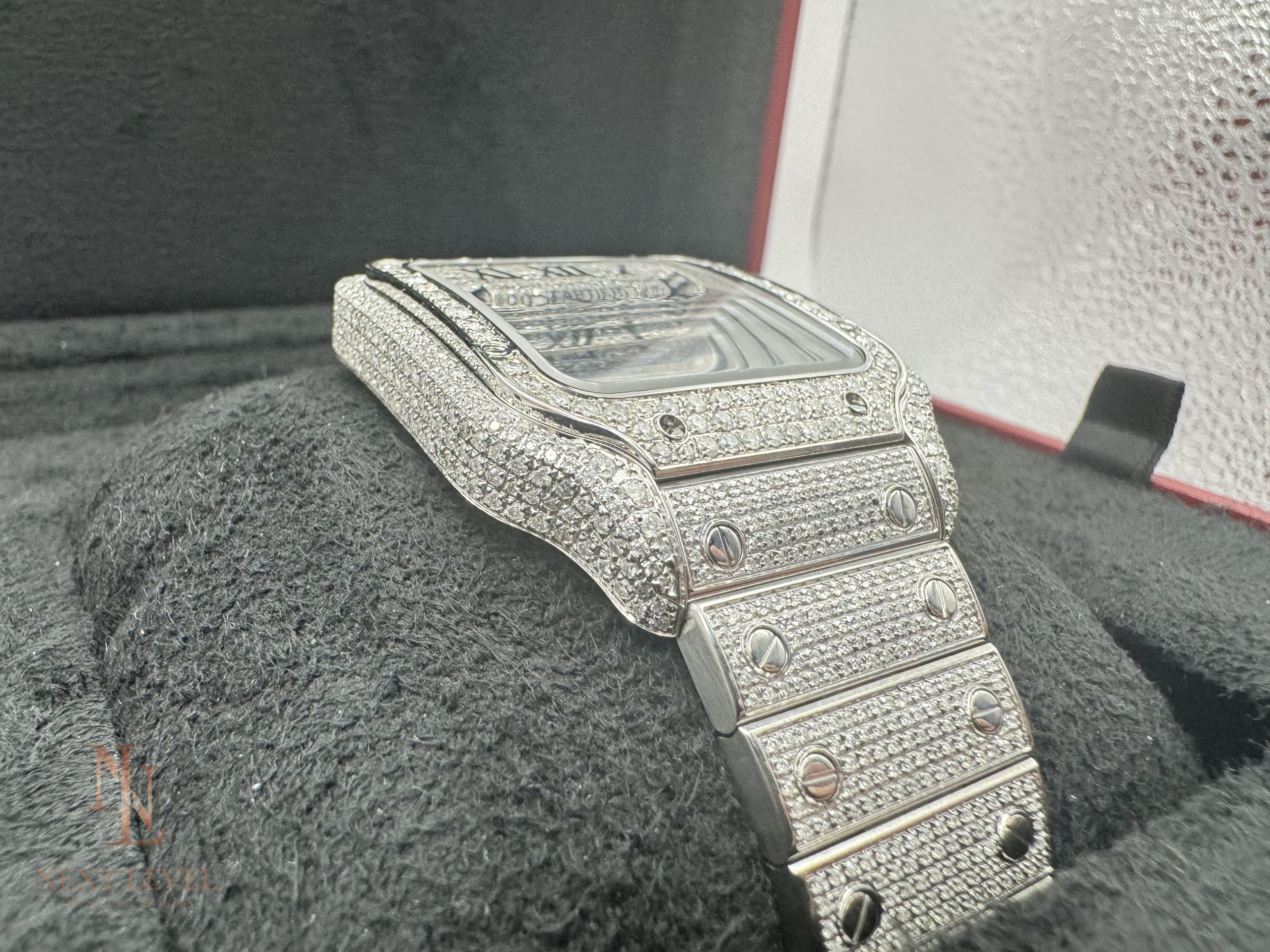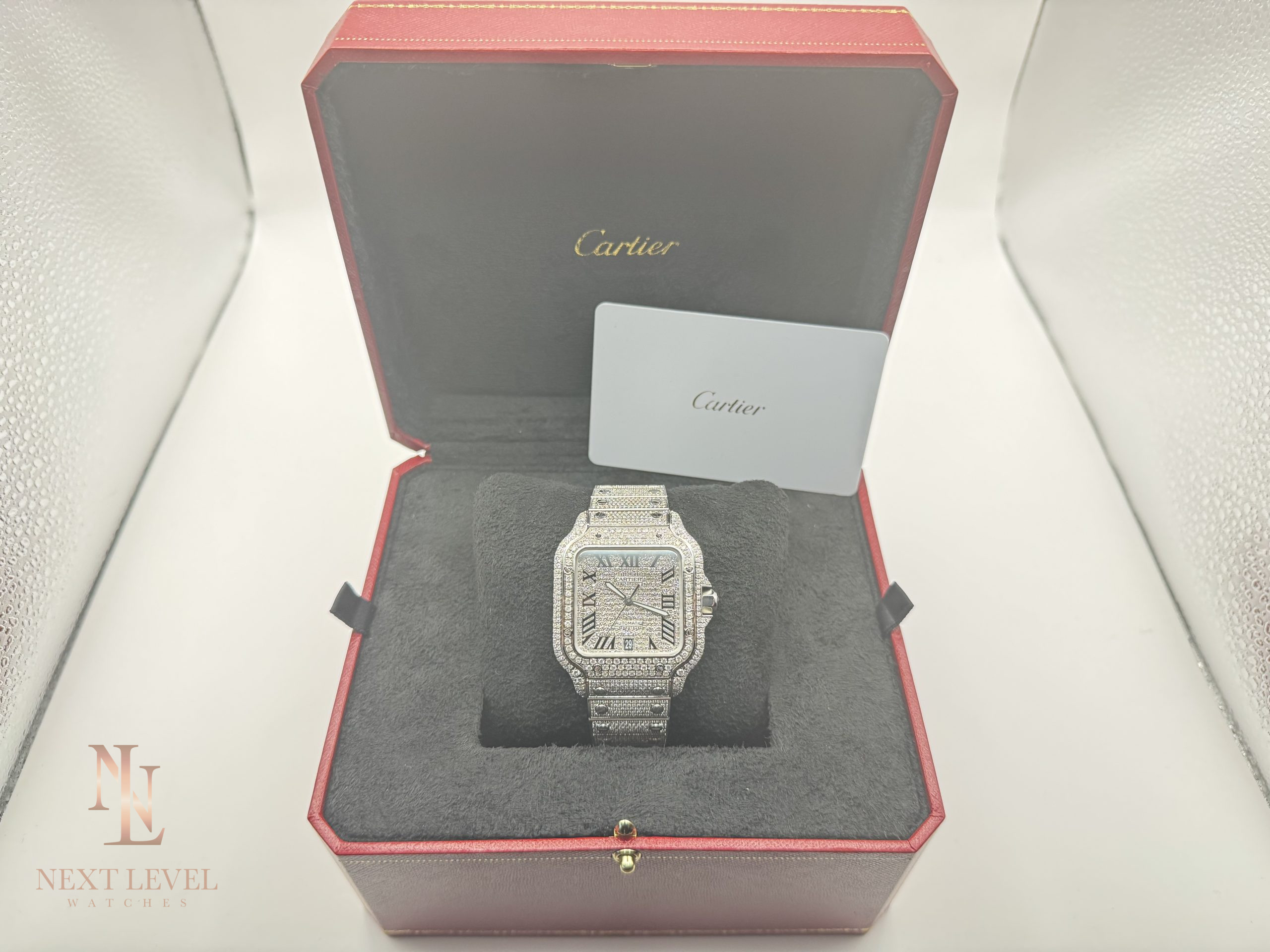 This iced out Cartier Santos offers a striking combination of elegance and extravagance, making it a perfect statement piece for those who appreciate luxury and fine craftsmanship. Complete with all original documentation and packaging, this watch is ready to be enjoyed or added to any discerning collection.