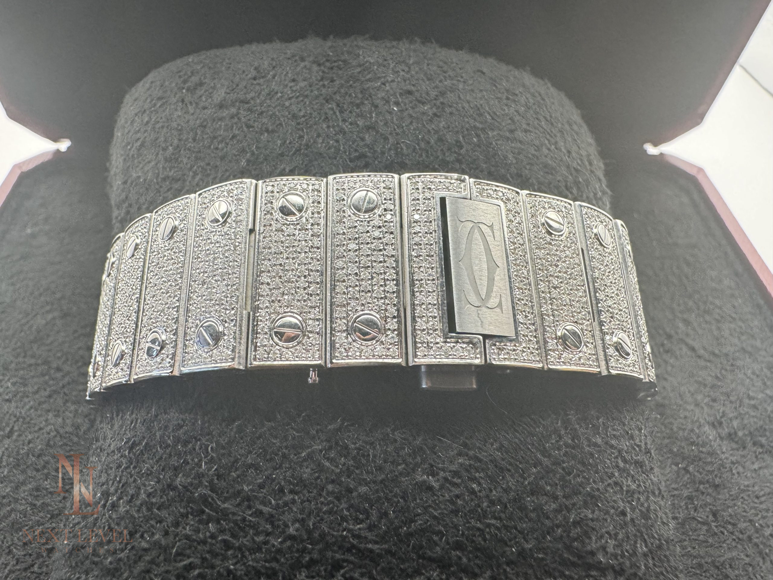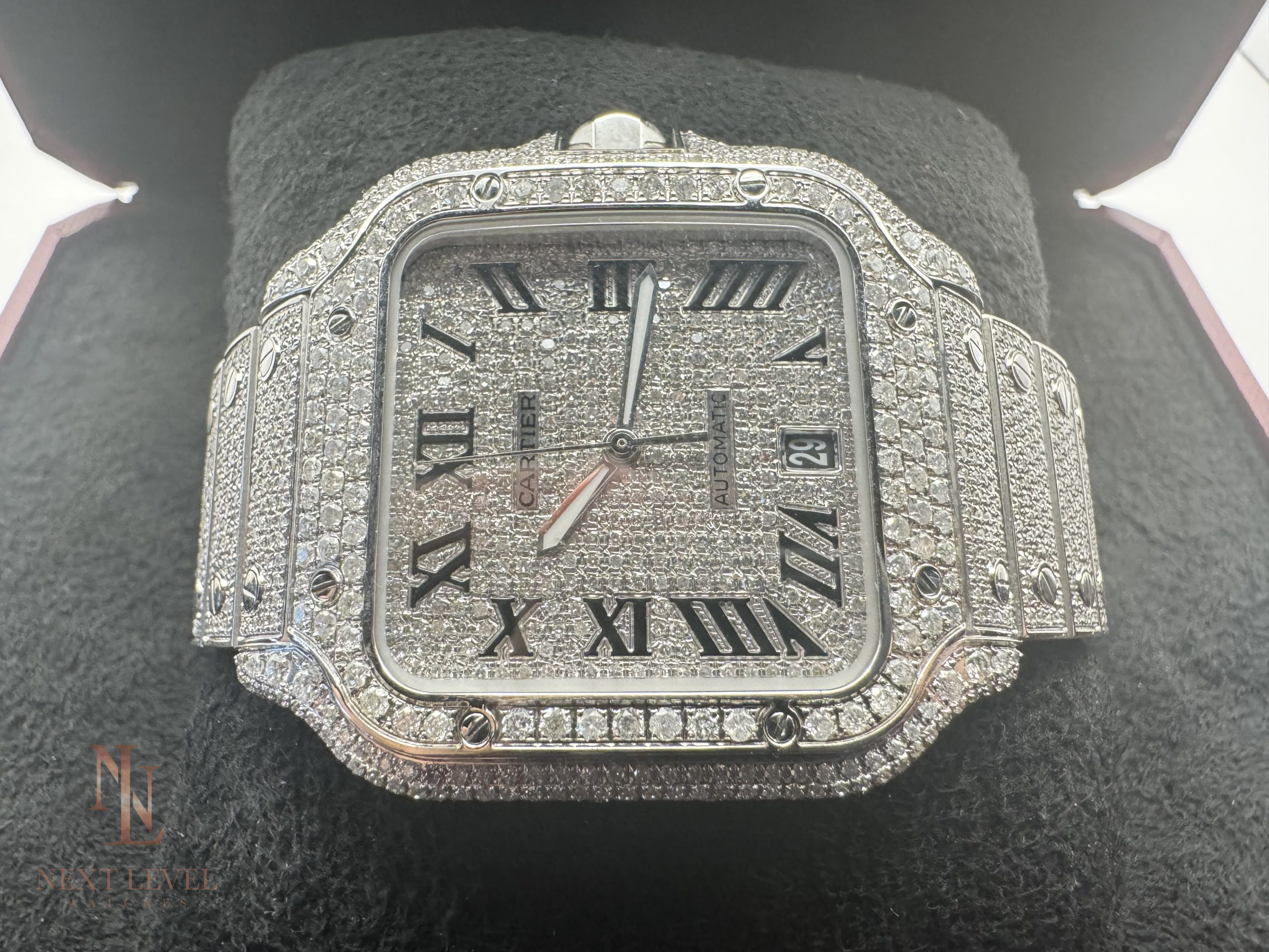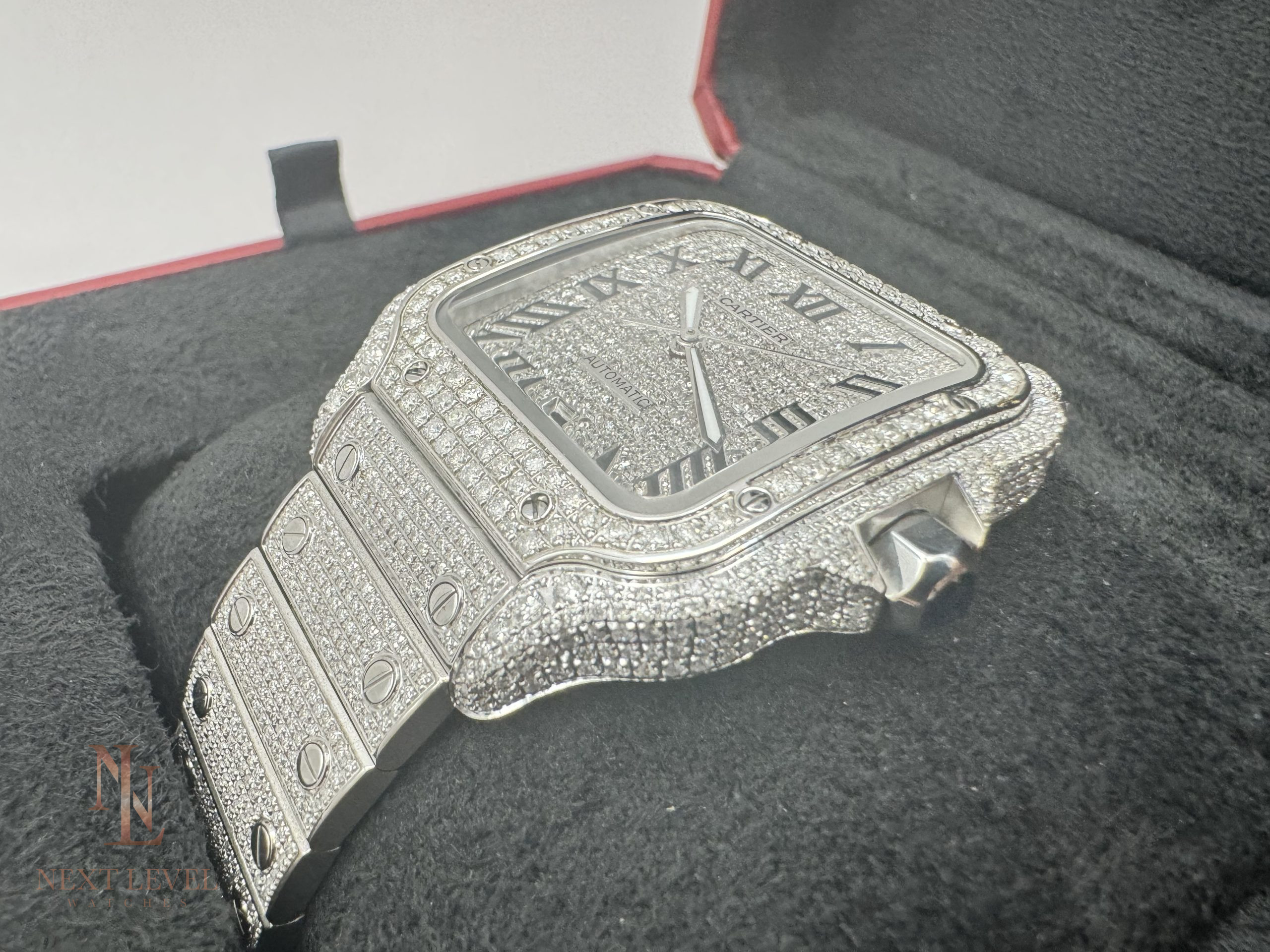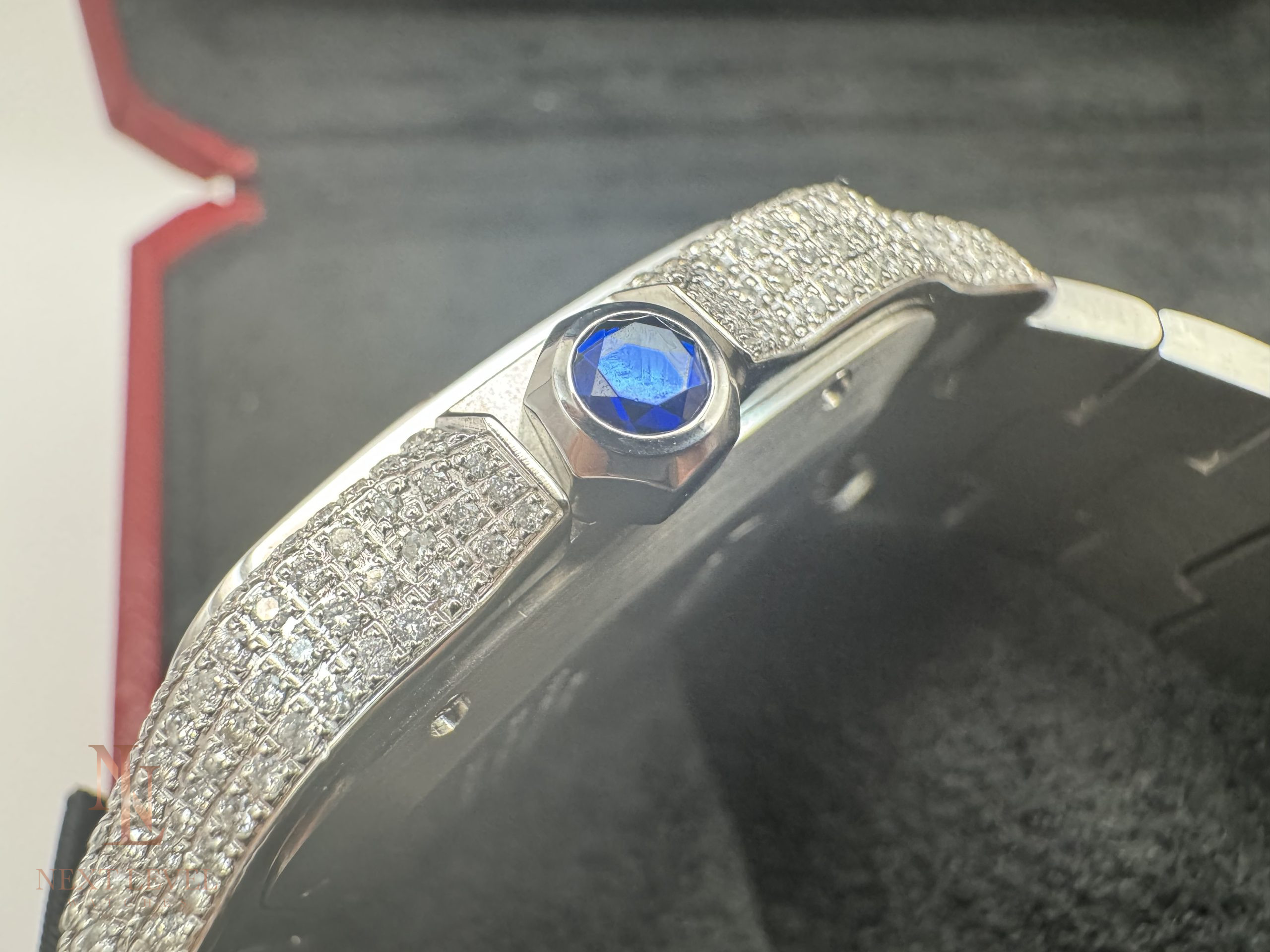 This iced out Cartier Santos offers a striking combination of elegance and extravagance, making it a perfect statement piece for those who appreciate luxury and fine craftsmanship. Complete with all original documentation and packaging, this watch is ready to be enjoyed or added to any discerning collection.