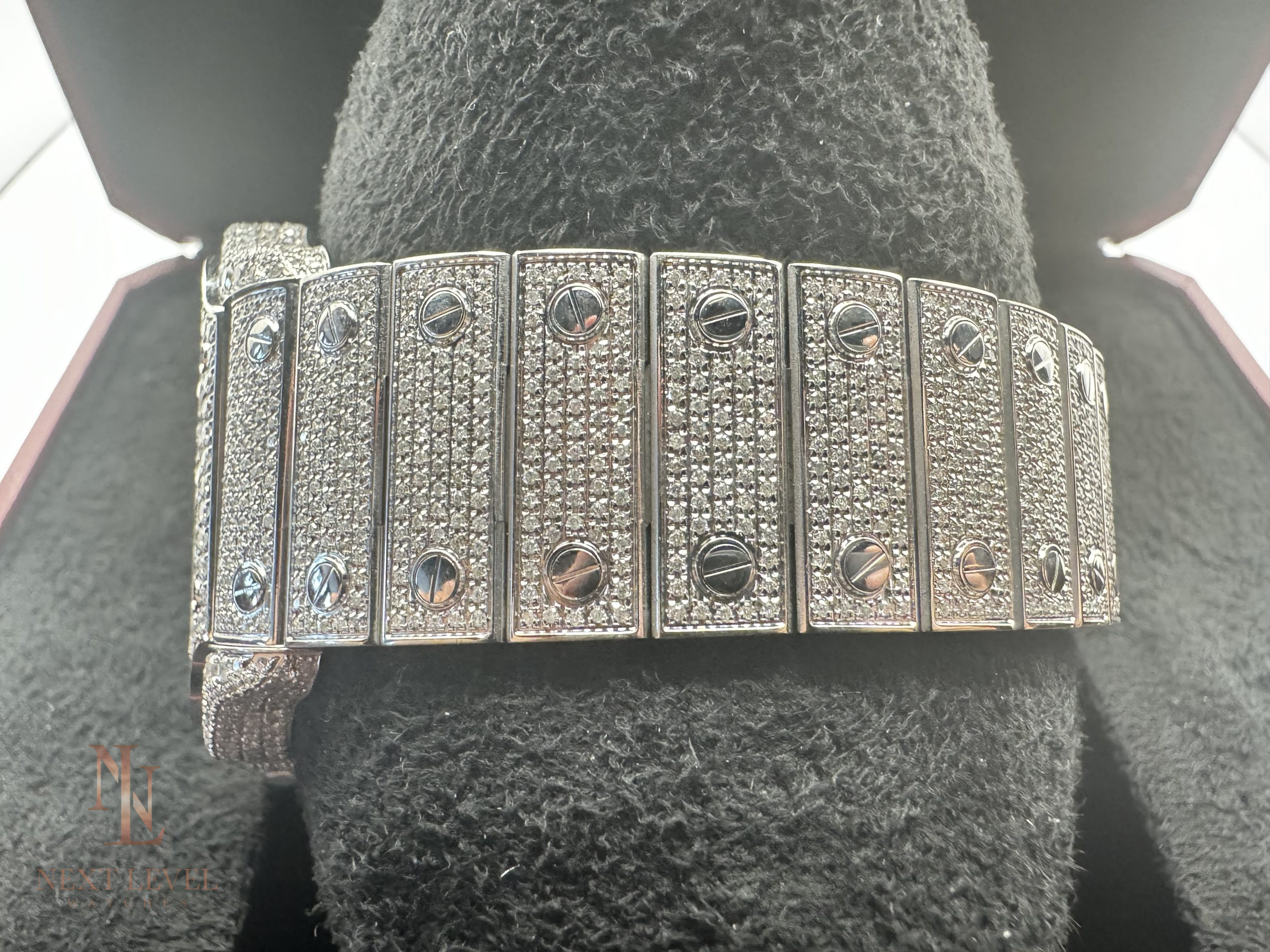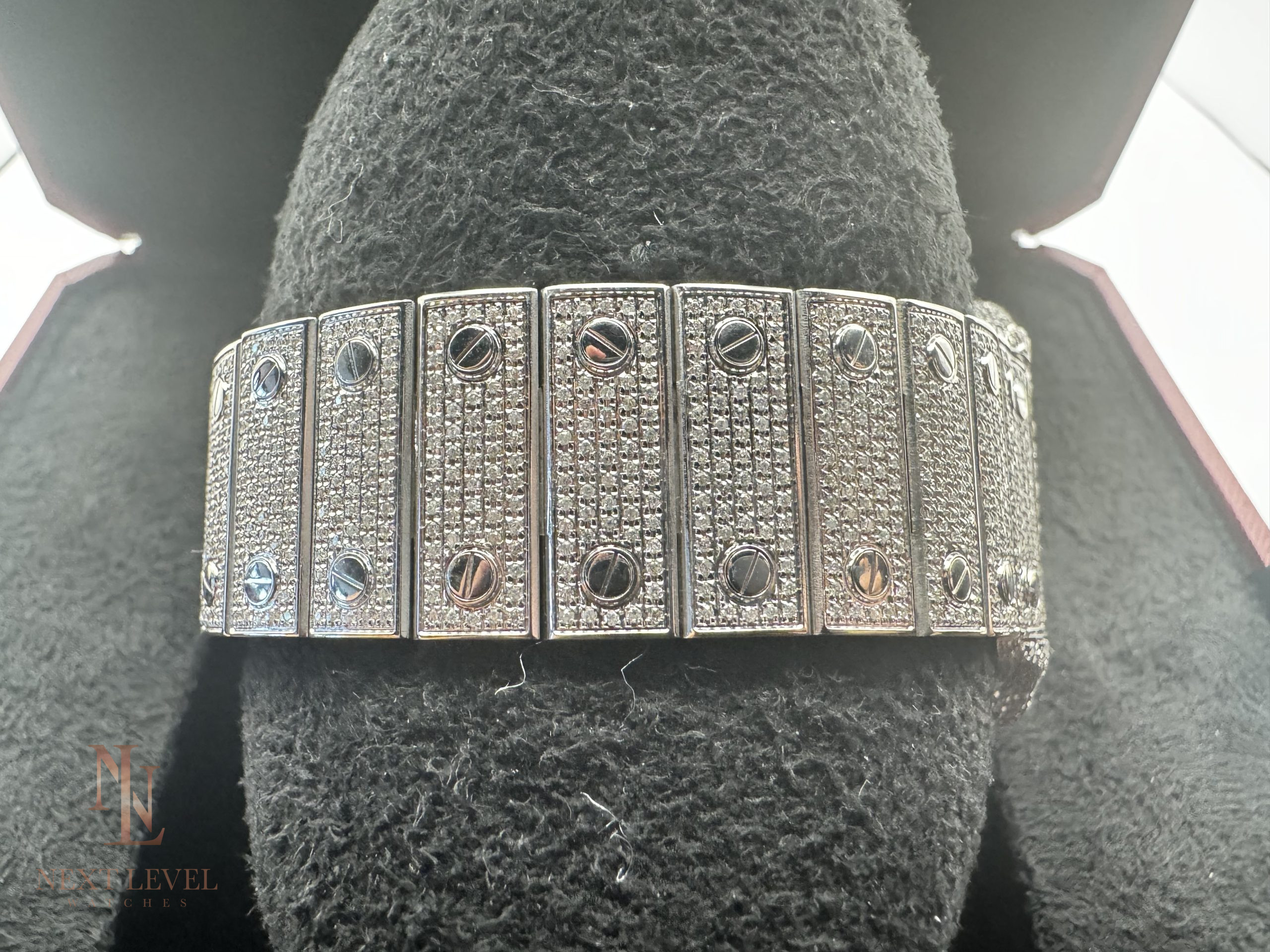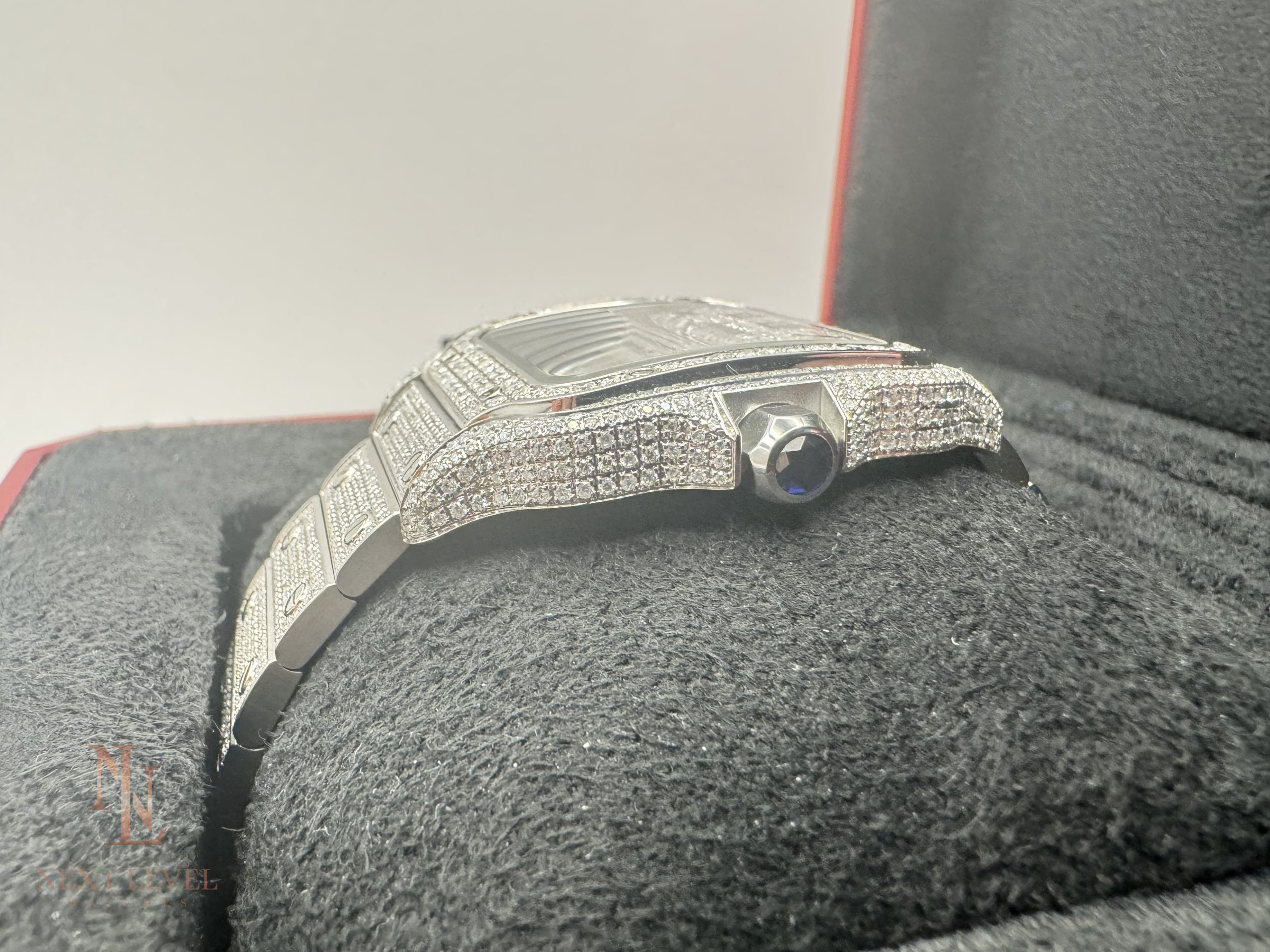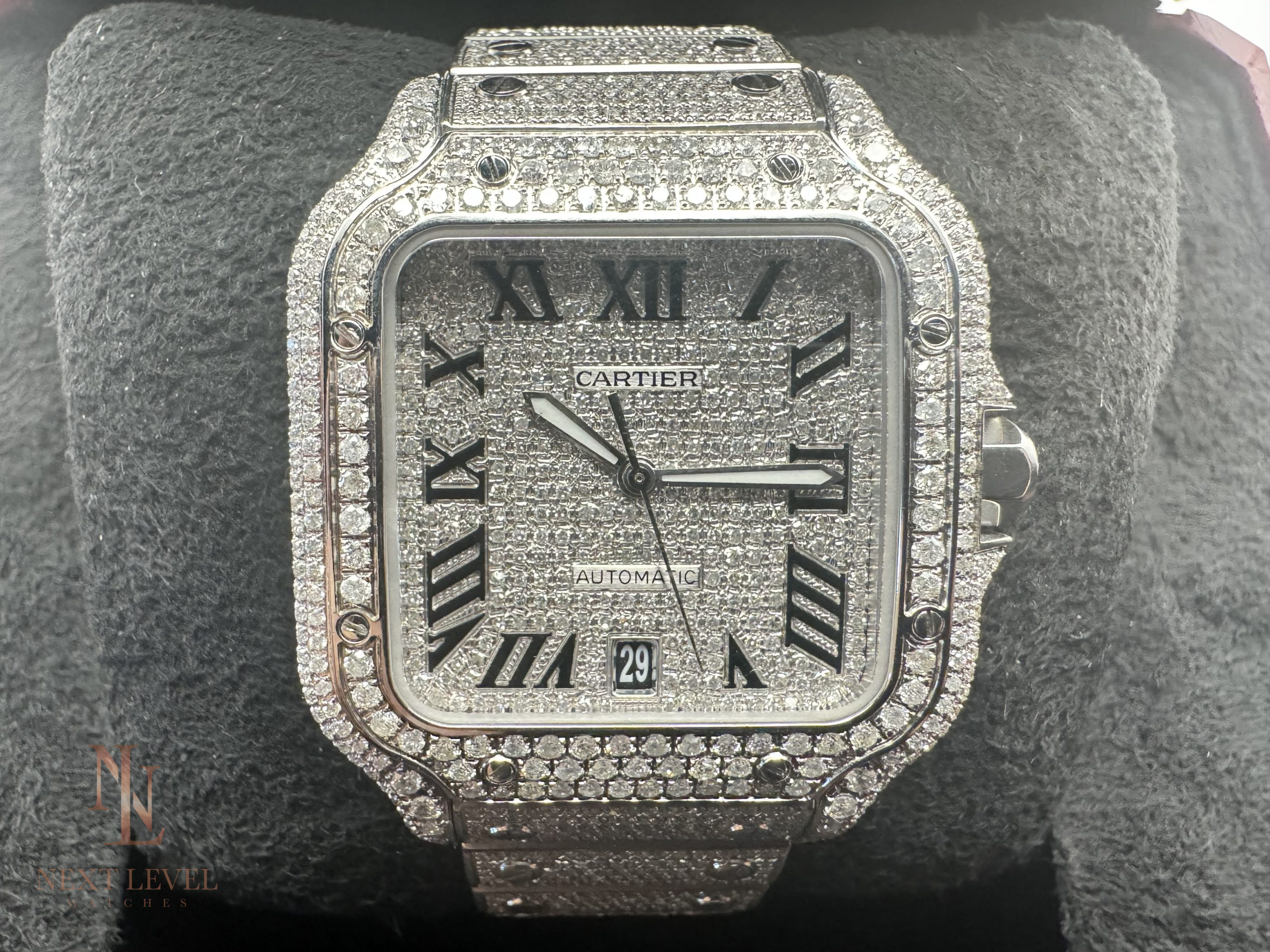 This iced out Cartier Santos offers a striking combination of elegance and extravagance, making it a perfect statement piece for those who appreciate luxury and fine craftsmanship. Complete with all original documentation and packaging, this watch is ready to be enjoyed or added to any discerning collection.