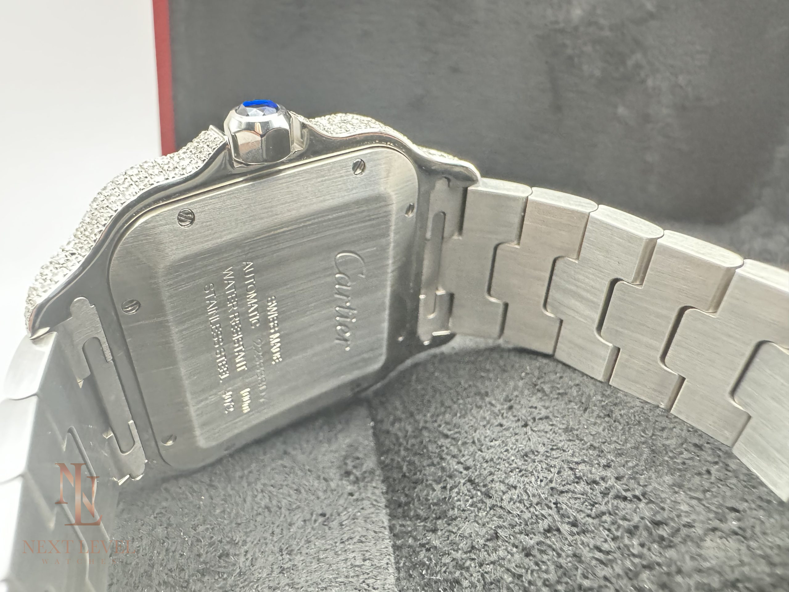 Introducing the iconic Cartier Santos Large (Reference WSSA0030), a timepiece that has been fully transformed with a stunning iced out finish, covered in diamonds for the ultimate luxury statement. This watch is brand new, completely unworn, and comes as a full set.