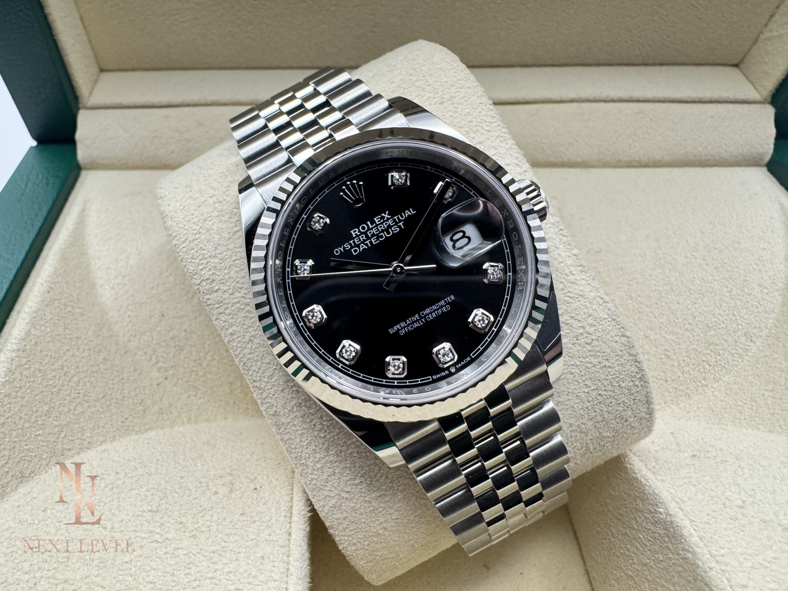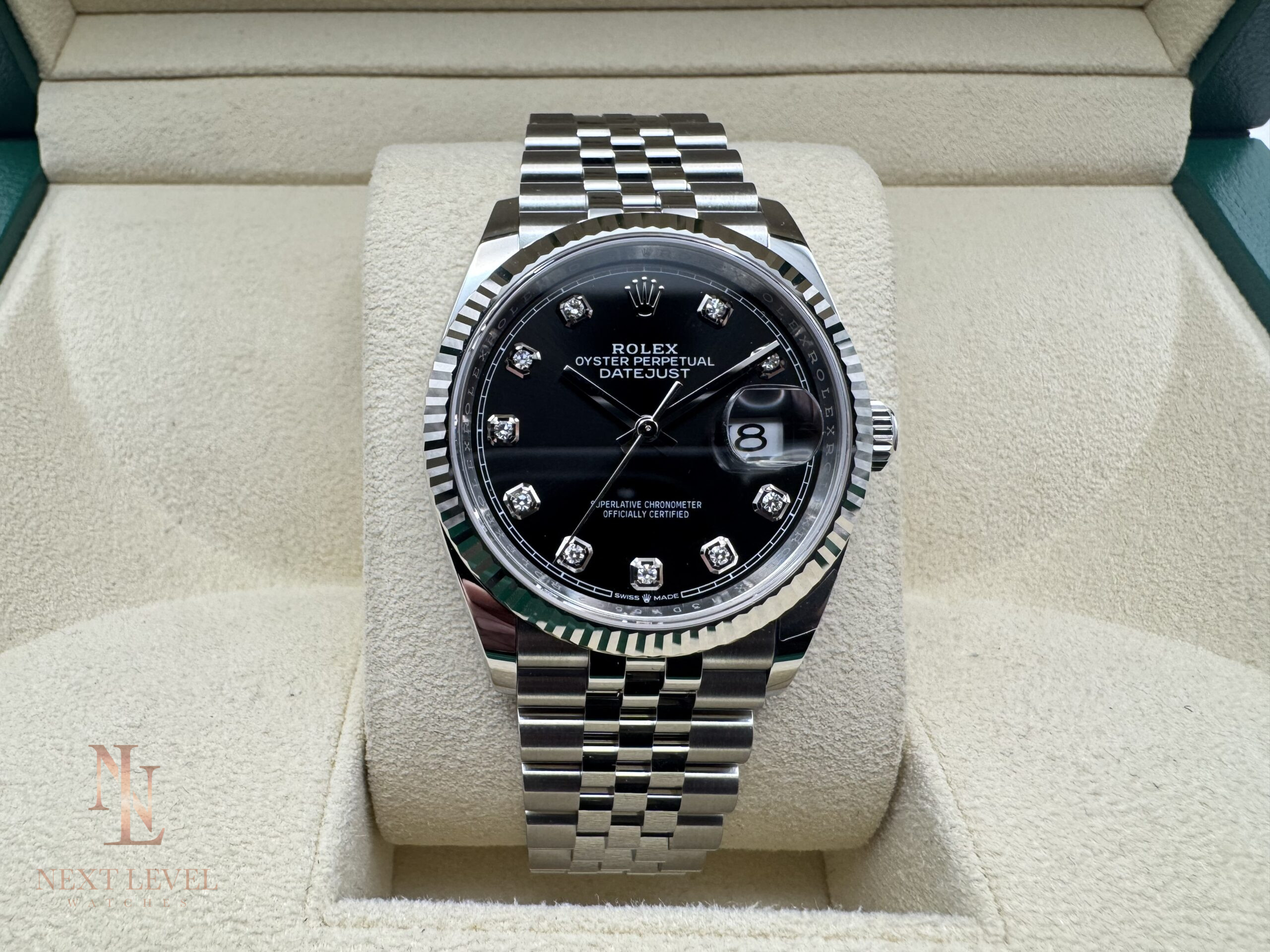 - Dial: Black with factory-set diamond hour markers