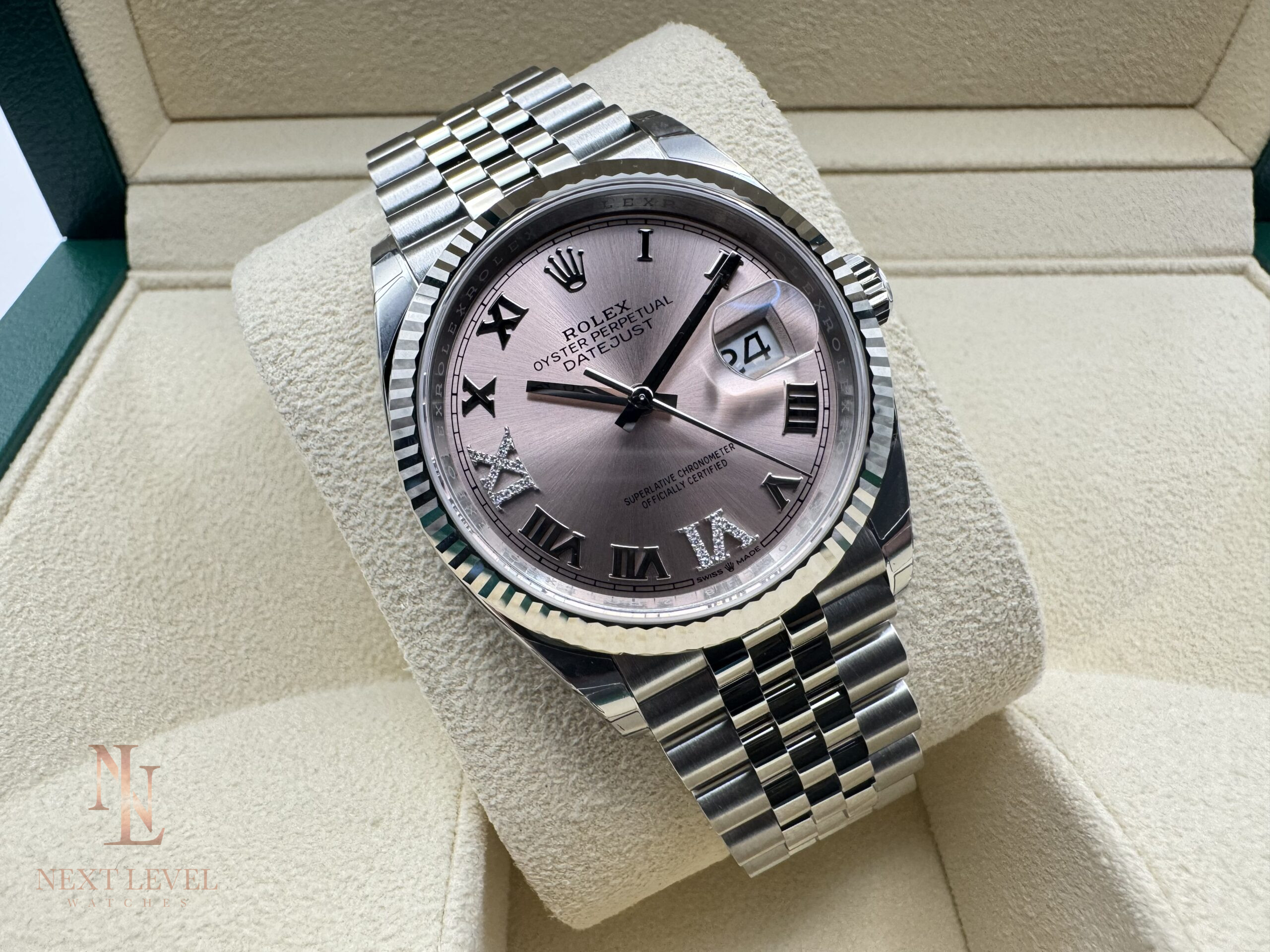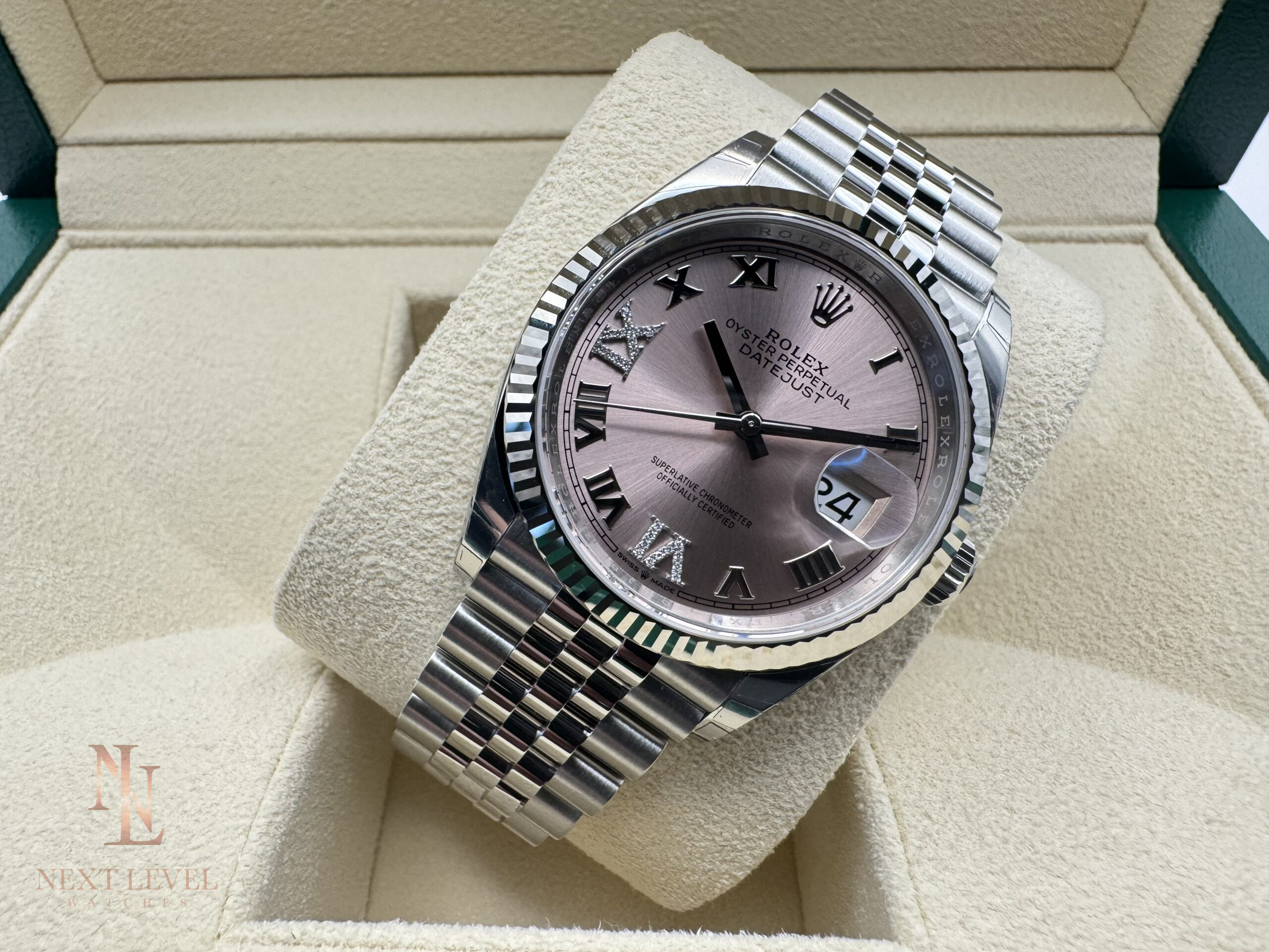 Up for sale is a brand new Rolex Datejust 36mm (Reference 126234) in stainless steel, featuring a beautiful pink dial with Roman numerals, where the 6 and 9 are set with diamonds. This elegant timepiece is paired with the timeless Jubilee bracelet and a fluted bezel, combining sophistication and luxury. The watch is completely unworn and comes as a full set, perfect for collectors or those seeking a refined everyday watch.