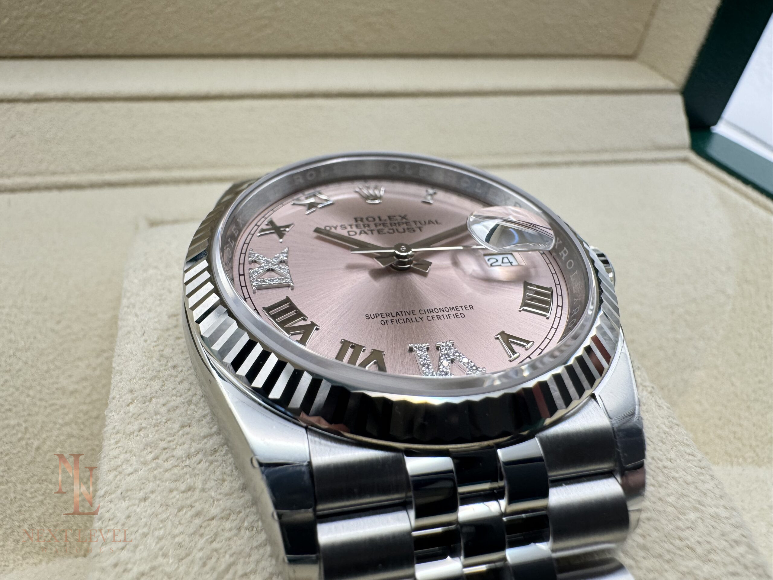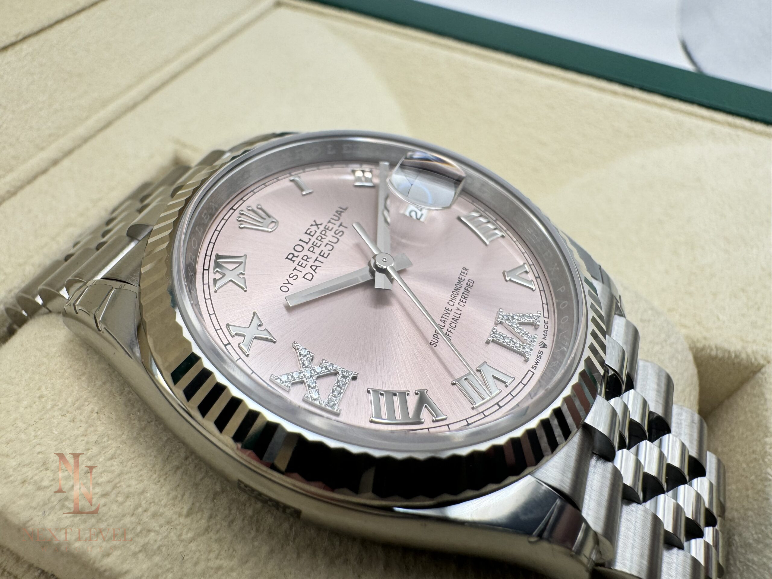 - Features: Pink dial with diamond-set 6 and 9 Roman numerals, Jubilee bracelet, automatic movement, scratch-resistant sapphire crystal