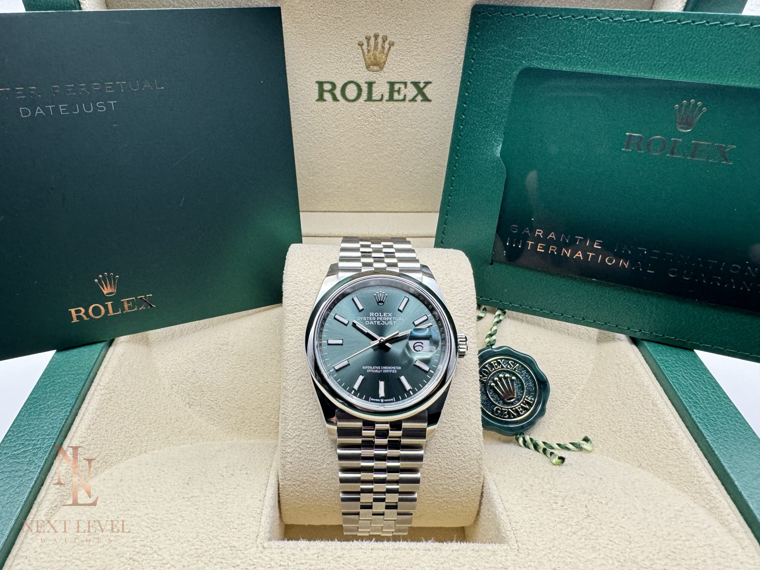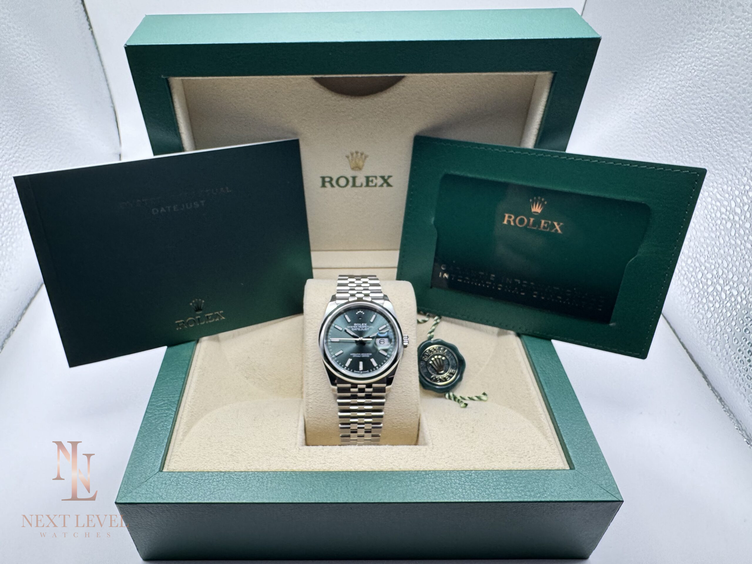 - Full set: Includes box, papers, warranty card, and Rolex tag