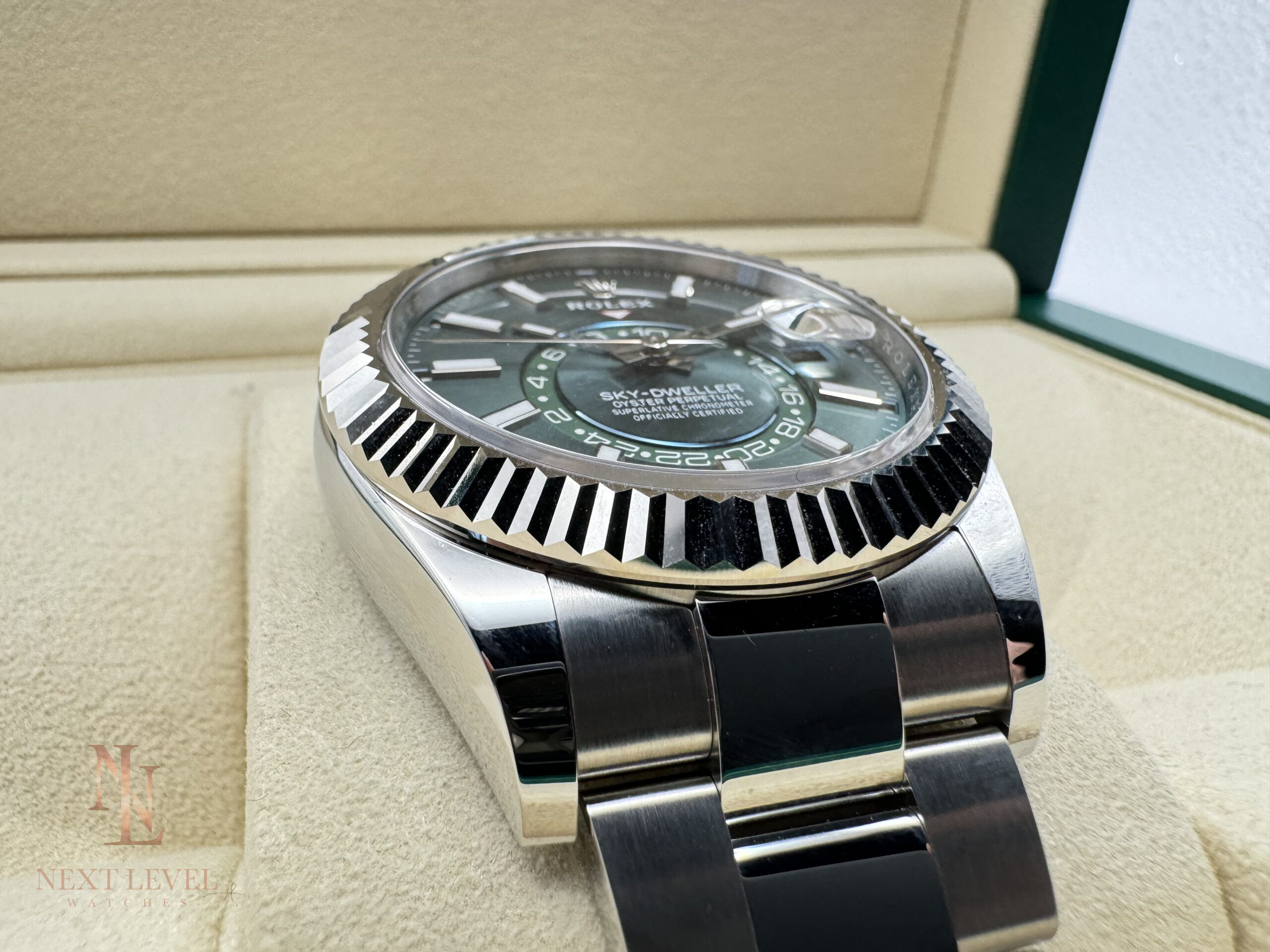 Introducing the highly coveted Rolex Sky-Dweller 336934 with the rare green dial, one of the most sought-after configurations. This timepiece is brand new, completely unworn, and comes as a full set, ready for a new owner.